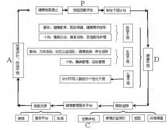 鮑勇將社區(qū)健康管理定義為: 對(duì)社區(qū)健康人群、疾病人群的健康危險(xiǎn)因素進(jìn)行全面監(jiān)測(cè)、分析、評(píng)估、預(yù)測(cè)、預(yù)防,維護(hù)和發(fā)展個(gè)人和家庭技能的全過程。